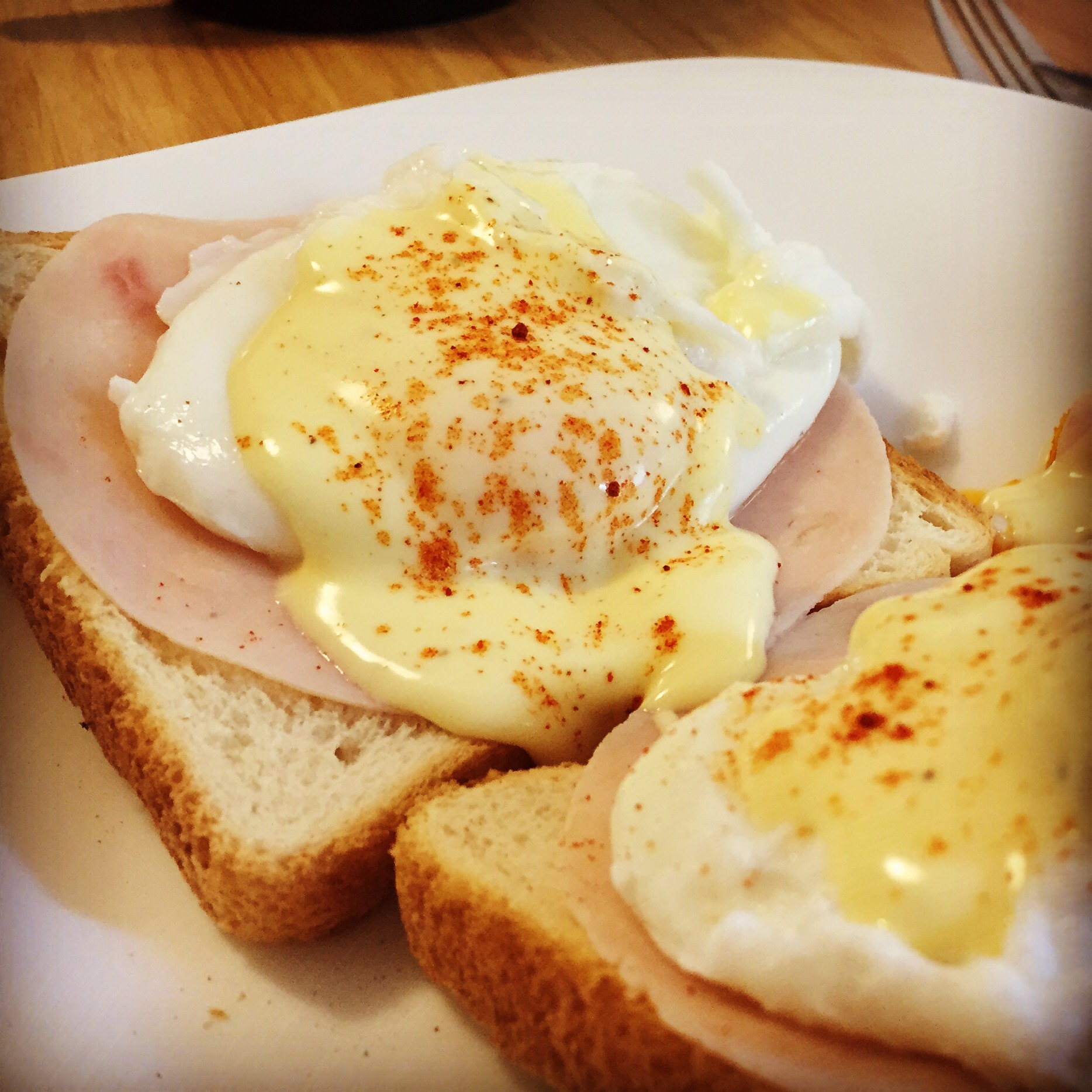 Luego sobre pan ligeramente tostado, poner: jamon york o de pavo, bacon, aguacate o salmon ahumado, eso es al gusto de cada quien, luego colocar el huevo poche y por último la salsa «holandesa», luego un toque de pimenton (pimiento en polvo).