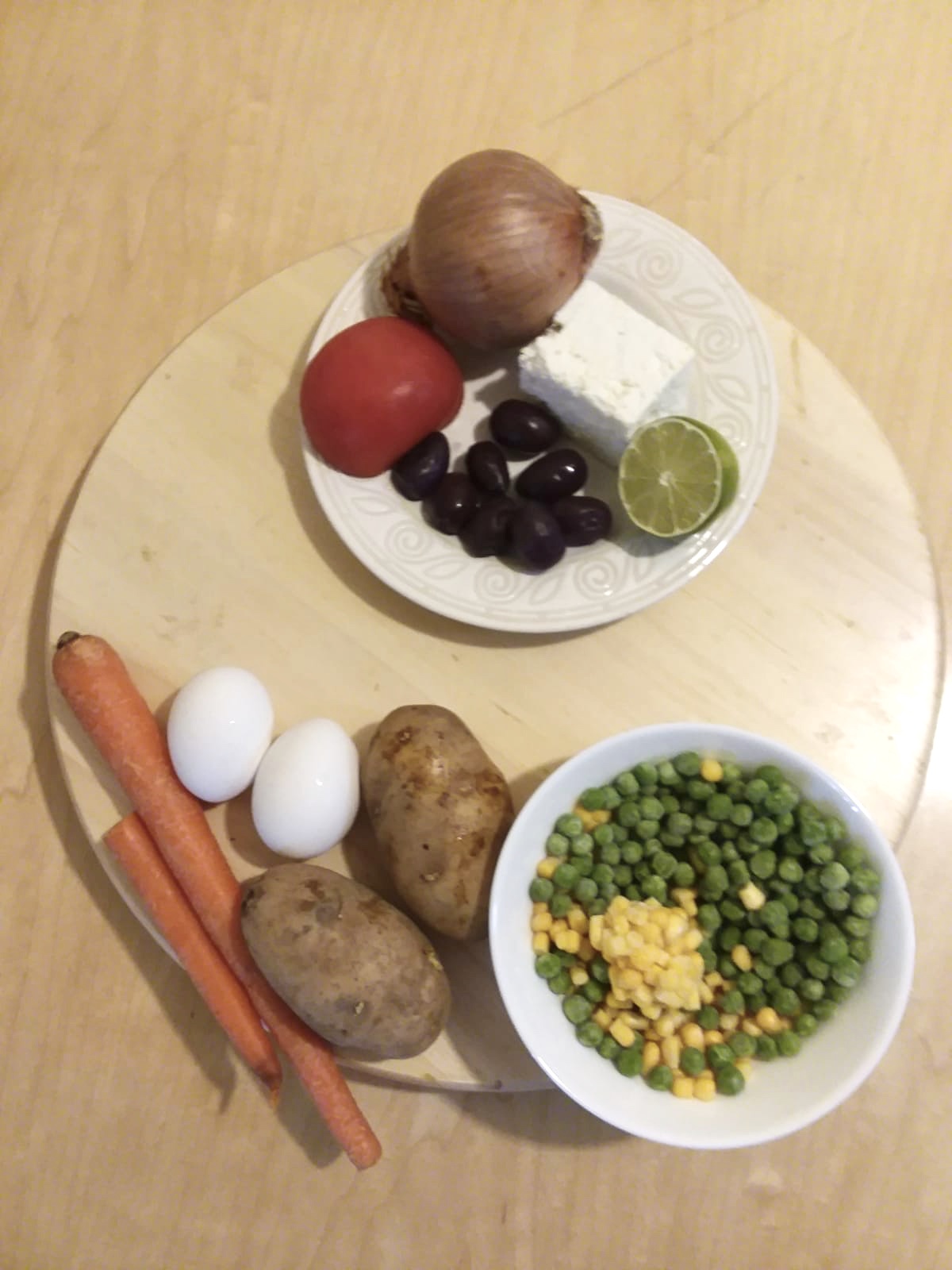 Poner en el pirex Sal pimienta limón y aceite y mover bien. Picar lo crudo y hecharlo al pirex. Agregar lo sancochado y mover suavemente. Al final los huevos picados para que no se deshagan las yemas, papas al lado.